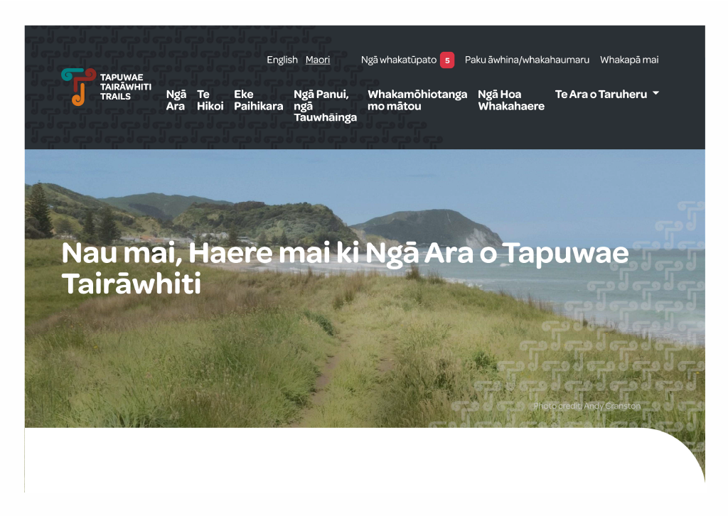 “The Tapuwae Tairāwhiti Trails Trust honours Te Tiriti o Waitangi, and acknowledges the original language of tāngata whenua, along with the tikanga of the language of Te Tairāwhiti. We want to contribute to revitalising te reo Māori by making the language accessible and visible in our website.